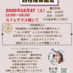- 【12月・1月・2月の鑑定スケジュールとイベントのお知らせ】日頃より、心結命(ここゆめ)の鑑定をご利用いただき誠にありがとうございます。下記… 続きを読む: 【12月・1月・2月の鑑定スケジュールとイベントのお知らせ】