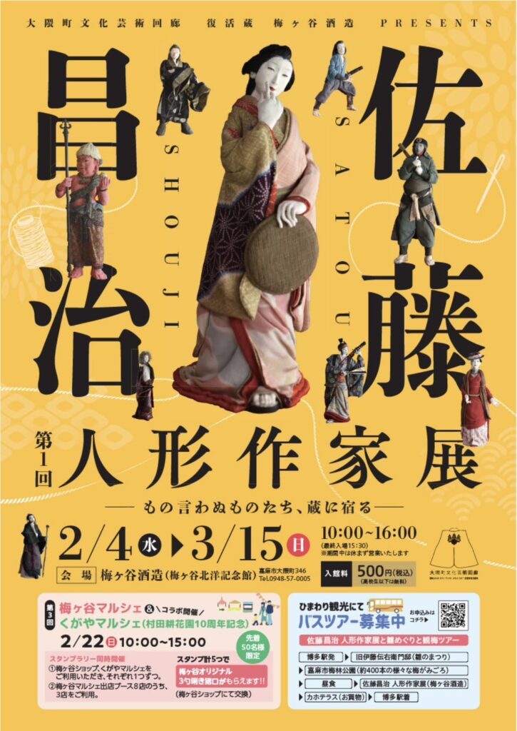 また当日は、博多方面からのバスツアーも予定されており、伊藤伝右衛門邸での雛まつり見学、梅林公園、佐藤昌治 人形作家展、そしてマルシェへとつながる流れになるそうです。
