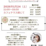 - 【3月6日限定】有智山荘 癒しのマーケット|四柱推命×カード占い 特別コラボ鑑定のご案内3月6日・7日に太宰府市内山で開催される、有智山荘「癒しのマーケット」に出店いた… 続きを読む: 【3月6日限定】有智山荘 癒しのマーケット|四柱推命×カード占い 特別コラボ鑑定のご案内